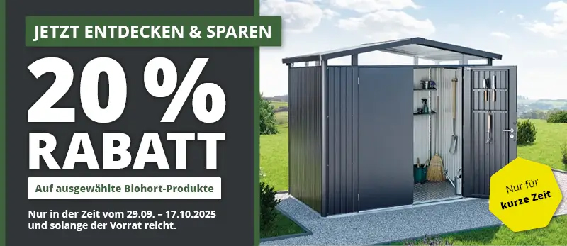 Biohort Gerätehäuser, Gartenboxen, Fahrradgaragen u.v.m. aus Metall überzeugen durch höchste Qualität und Langlebigkeit. Sichern Sie sich bis zum 17.10.2025 satte 20% Rabatt auf ausgewählte Biohort-Artikel.